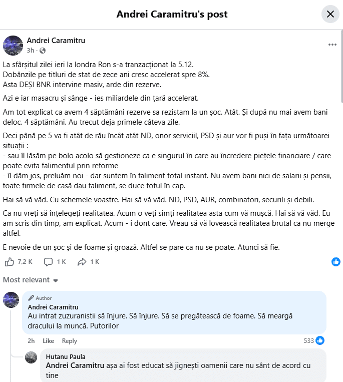Declarația lui Andrei Caramitru se înscrie în linia mesajelor sale recente: scenarii dure, avertismente privind prăbușirea economică și presiune publică pentru menținerea actualei direcții politice.